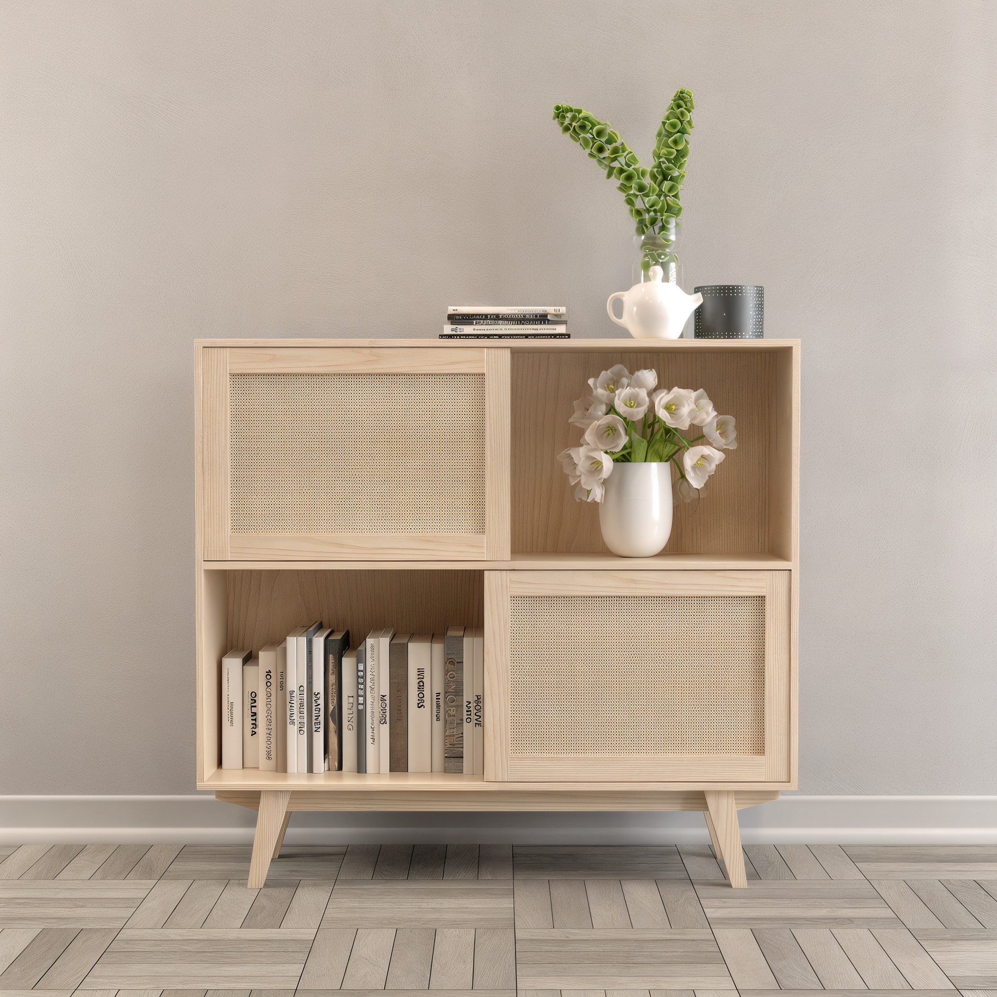 Almacenamiento: 4 compartimentos (2 abiertos, 2 cerrados con puertas de rattan)
