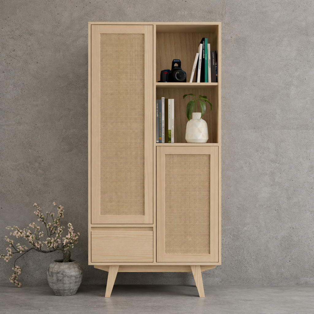 Su formato vertical permite aprovechar al máximo espacios pequeños o estrechos. Con dos puertas de rattan, dos estantes abiertos y un cajón inferior, este estante es perfecto como librero, aparador alto, mueble organizador de cocina o pieza auxiliar para dormitorios y oficinas. Aporta textura, calidez y ligereza visual en ambientes con estética natural.