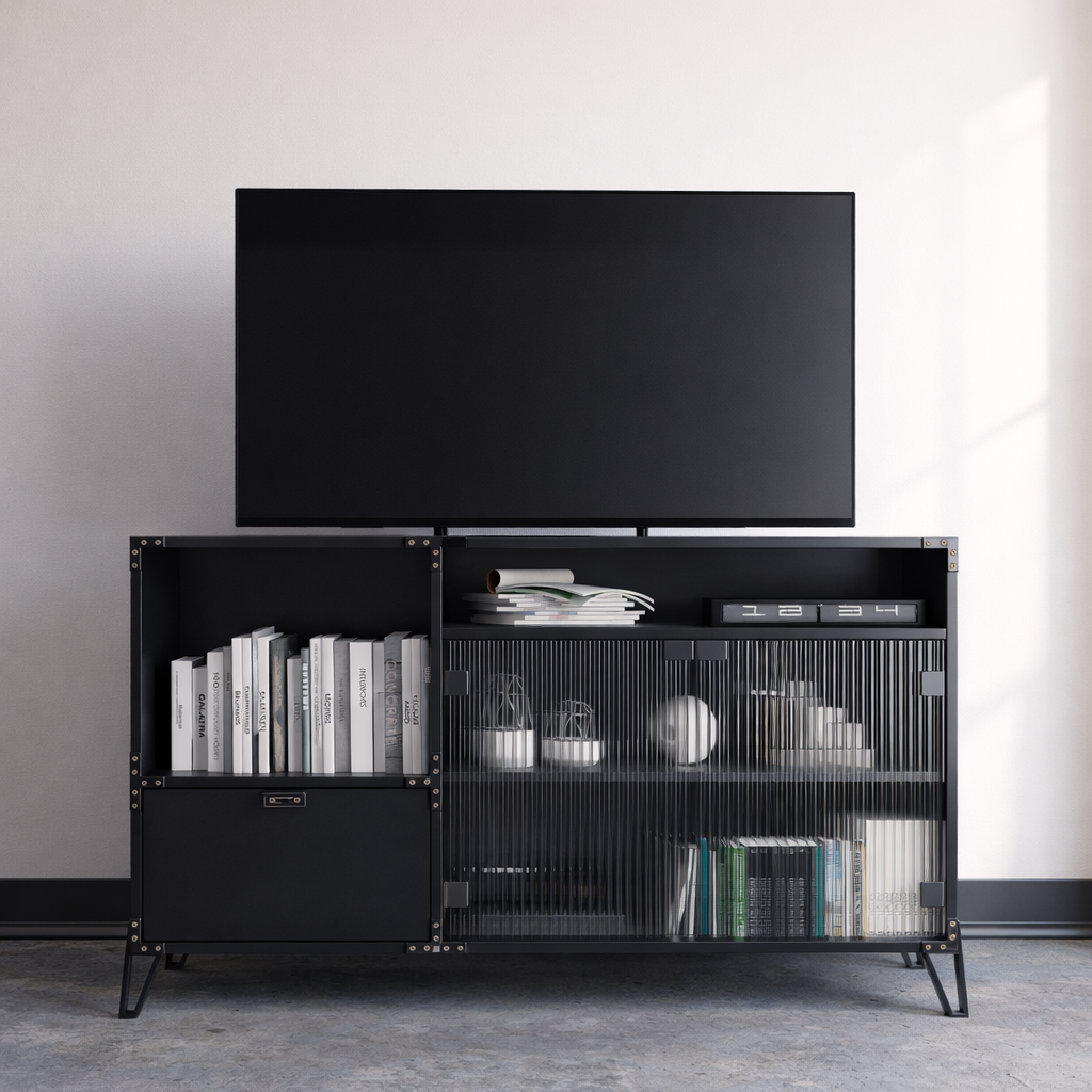Su diseño compacto y elegante es ideal para colocar televisores, consolas, libros u objetos decorativos, manteniendo todo organizado y al alcance. El contraste entre la madera clara y los detalles negros refuerza el carácter industrial contemporáneo de la Línea Rock.