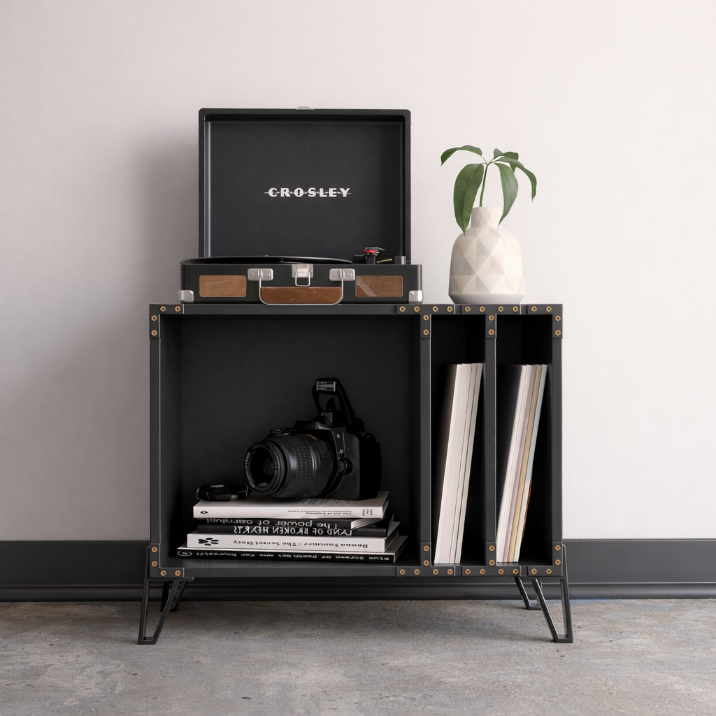 Cuenta con compartimentos inclinados que facilitan el acceso y exhibición de vinilos, libros o revistas, manteniendo el orden con estilo. Su formato versátil lo hace ideal como mueble auxiliar en livings, estudios o salas de música.